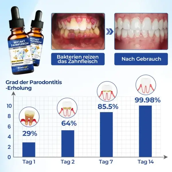 “Früher war mein Zahnfleisch fast jedes Mal, wenn ich mir die Zähne putzte, geschwollen und schmerzte, und ich machte mir zunehmend Sorgen, da es langsam zurückging. Ein Freund empfahl mir Biancat® BeeTakt Oral Repair Solution, also habe ich es vor etwa einer Woche in meine tägliche Routine aufgenommen. Die Verbesserung trat schnell ein – innerhalb weniger Tage ging die Schwellung deutlich zurück und die Empfindlichkeit beim Essen war fast vollständig verschwunden. Nach regelmäßiger Anwendung fühlt sich mein Zahnfleisch viel stärker an als zuvor, und ich bin endlich zuversichtlich und beruhigt, da ich weiß, dass sich die Gesundheit meines Zahnfleisches verbessert.”