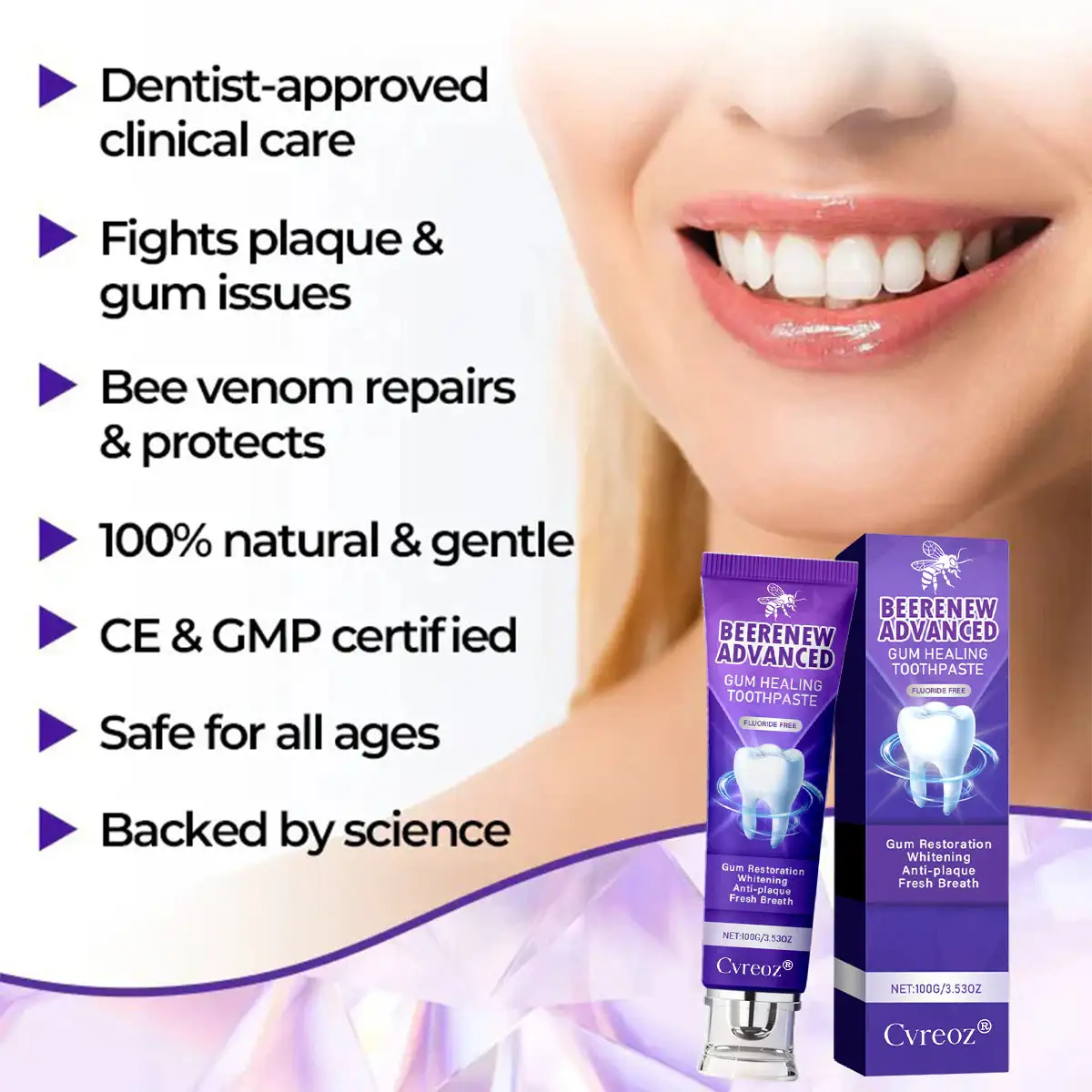 Cvreoz® BeeRenew is a naturally formulated toothpaste that combines purified bee venom with clinically tested plant extracts to support gum repair and overall oral health. Use it just like a regular toothpaste — apply a small amount to your toothbrush and brush normally.