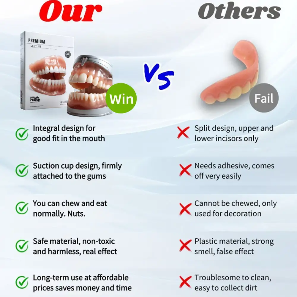 Instant Perfect Smile: Transform your smile instantly with the . Experience the satisfaction of achieving a flawless. customized fit right away. Our innovative denture set eliminates the discomfort of poorly fitting dentures. offering you a snug and natural feel that makes your dentures feel like a true part of your mouth. Say goodbye to sore spots and irritation as Denture Set provides immediate relief. allowing you to enjoy your smile with newfound confidence and comfort. Enjoy a seamless transition to a better-fitting. more comfortable denture experience without delay.