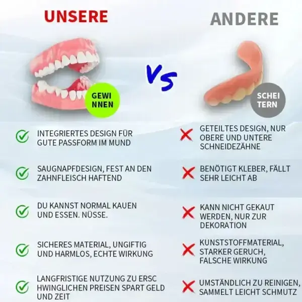 Verwandeln Sie Ihr Lächeln sofort! Erleben Sie die Zufriedenheit, einen makellosen, individuell angepassten Sitz zu erreichen. Unser innovatives Prothesenset beseitigt das Unbehagen von schlecht sitzenden Prothesen und bietet Ihnen ein angenehmes und natürliches Gefühl, das Ihre Prothese wie einen echten Teil Ihres Mundes wirken lässt. Verabschieden Sie sich von schmerzhaften Stellen und Reizungen, denn das Prothesenset bietet sofortige Linderung und ermöglicht es Ihnen, Ihr Lächeln mit neuer Zuversicht und Komfort zu genießen. Erleben Sie den nahtlosen Übergang zu einer besseren Passform und einer komfortableren Prothesen-Erfahrung – ohne Verzögerung.