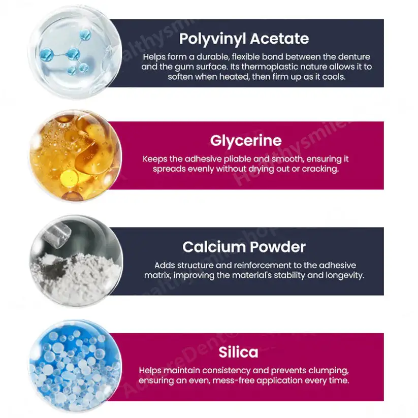 Polyvinyl acetate, a key binder known for its excellent adhesive properties, helps create a durable and flexible bond between the denture and the gum surface. Its thermoplastic nature allows it to soften when heated and then harden upon cooling—creating a custom-fit seal that stays in place for several days.